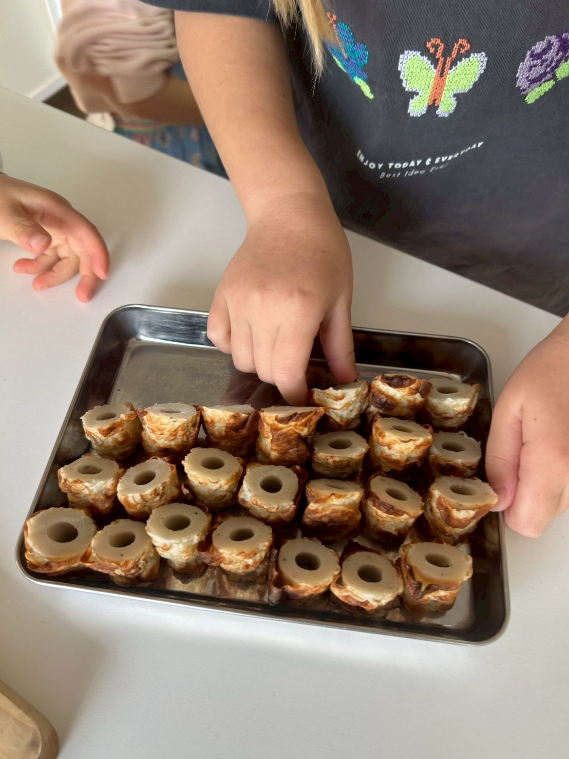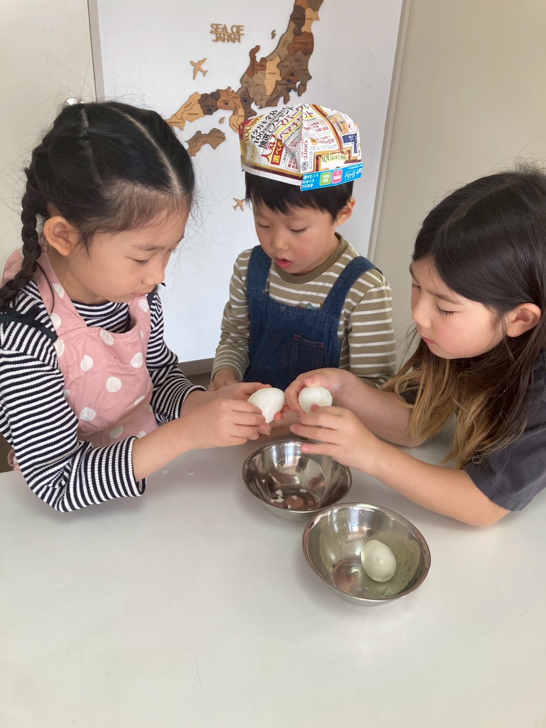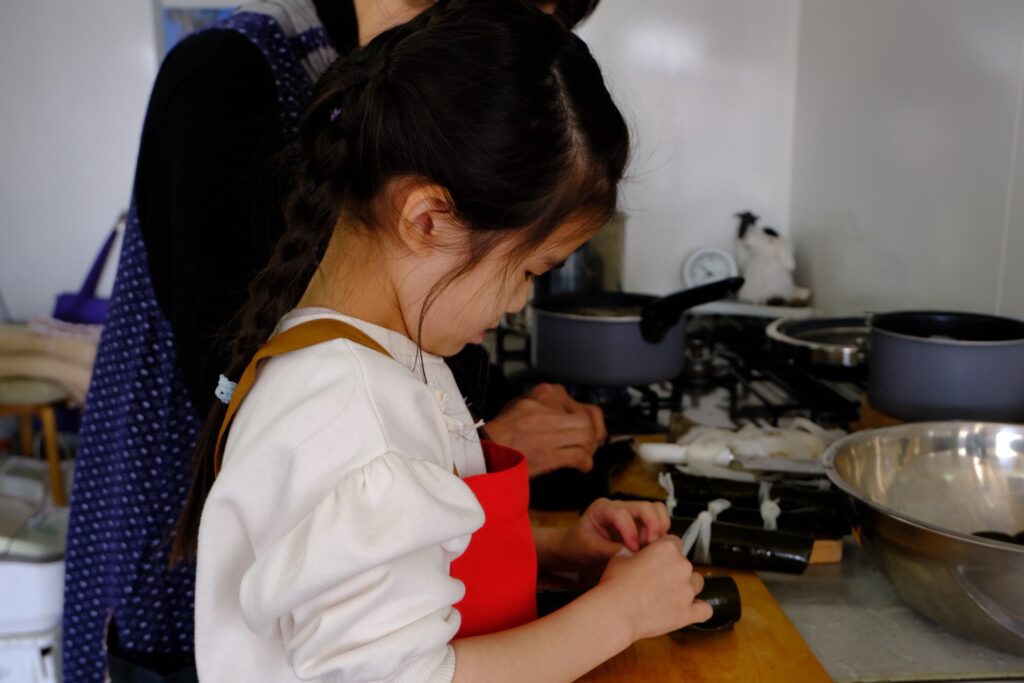 作業はまだまだ続きます。茹で卵の殻むきでは、「ちょうどよい力で殻全体にヒビを入れること」「爪を立てて剥かないこと」を最初に伝えました。白身が崩れないように気をつけて、小さい子どもたちも、力加減を意識しながら上手に剥くことができていました。みんなが卵の殻を剥いている間に、昆布にかんぴょうを結ぶ作業をしてくれた子もいました。たくさんの昆布に、とても手際よく綺麗に結んでいってくれました。