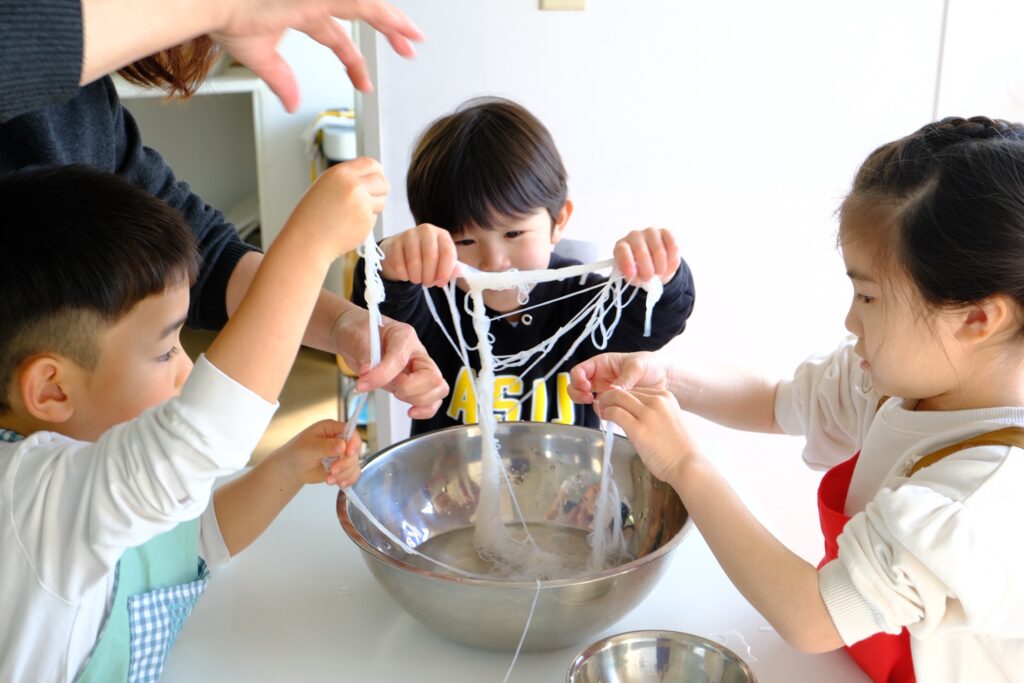 続いて作業する白滝を見て「これ何?」と尋ねる子も。「こんにゃくの仲間だよ」と伝えると、「こんにゃくの麺だね」と表現していました。長くてつるつると滑る白滝を結ぶ作業は、最初はなかなか思うようにいかず、どの子も苦戦している様子でした。それでも何度も挑戦するうちに少しずつ上達し、頑張って結びきることができました。