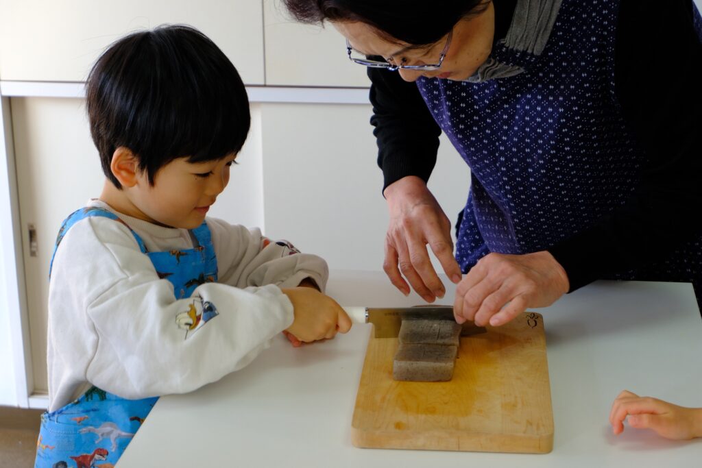 次はこんにゃくです。表面に格子状の切り込みを入れていき、三角形に切ります。大根に比べて柔らかく、表面を浅く切るのはなかなか力加減が難しかったと思いますが、みんなとても上手にできていました。