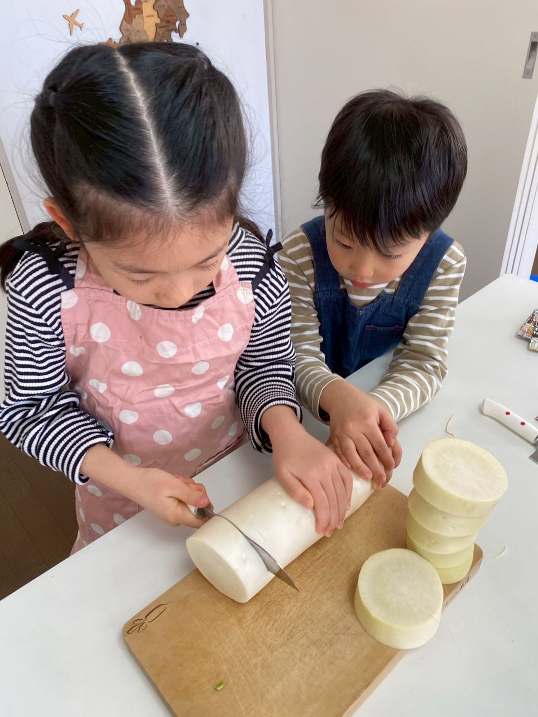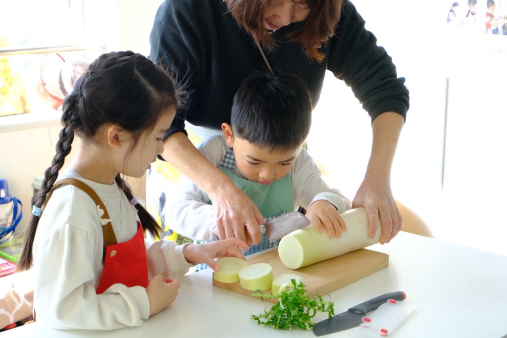 最初は大根の下ごしらえをします。立派な大根を輪切りにし、隠し包丁を入れる作業をしてもらいました。縦、横、斜めに入れる切り込みの形を見て「星みたい!」という声も上がります。中には難しい面取りに挑戦した子もいました。隠し包丁も面取りも集中力が必要ですが、丁寧に取り組む姿が印象的でした。