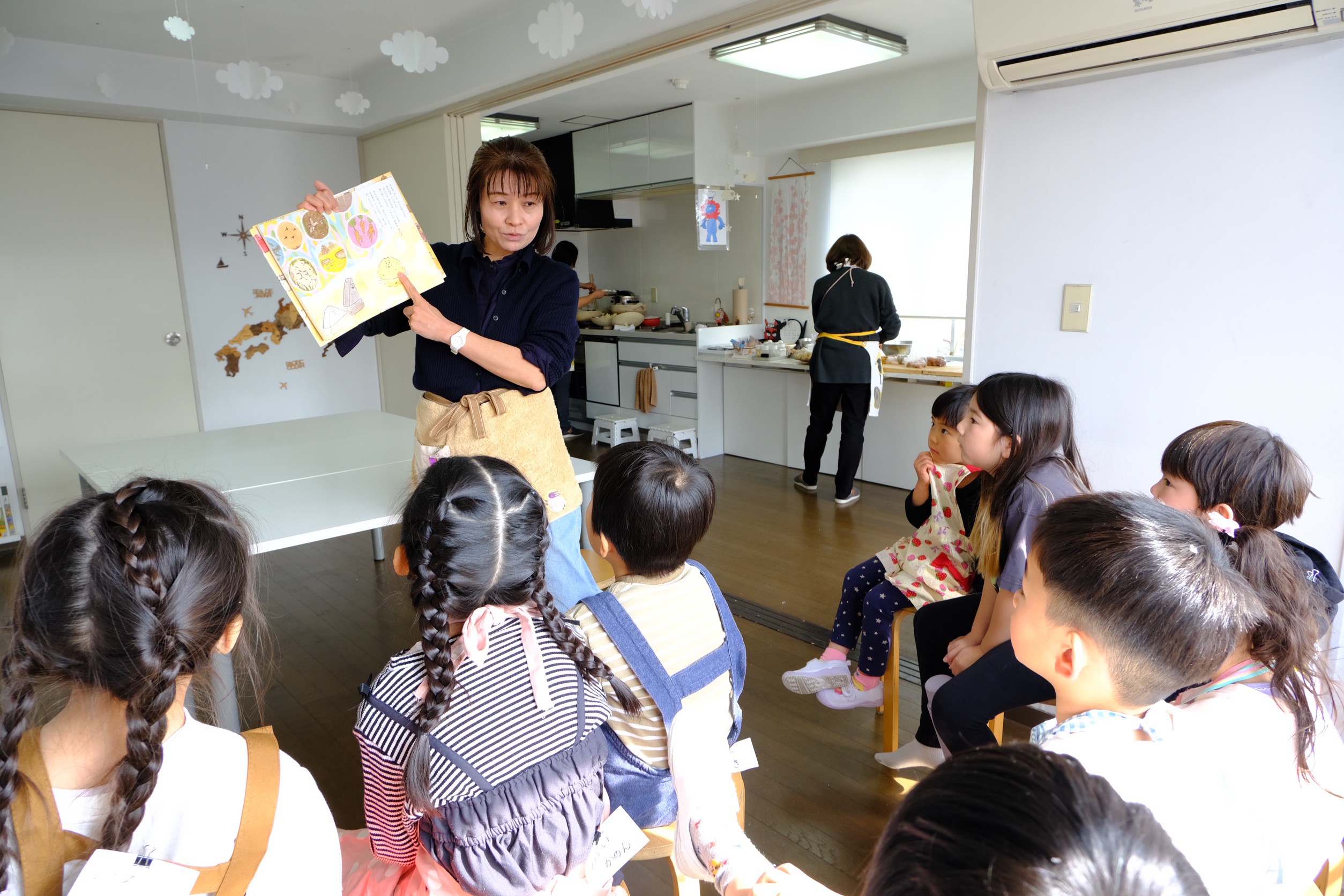 土鍋を火にかけたら絵本の時間です。「入れた具材を見つけたら手を上げて教えてね」と言うと、「はい!」と元気よくたくさんの手が上がりました。自分たちが実際にした作業を思い出しながら聞いている様子が印象的でした。