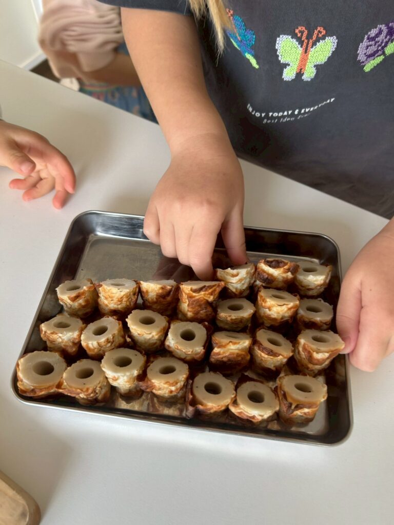 焼きちくわは3等分にしたあと、斜めにカットします。切られた形を見て「門松みたい!」と表現する子がいて、子どもたちの想像力に驚かされました。