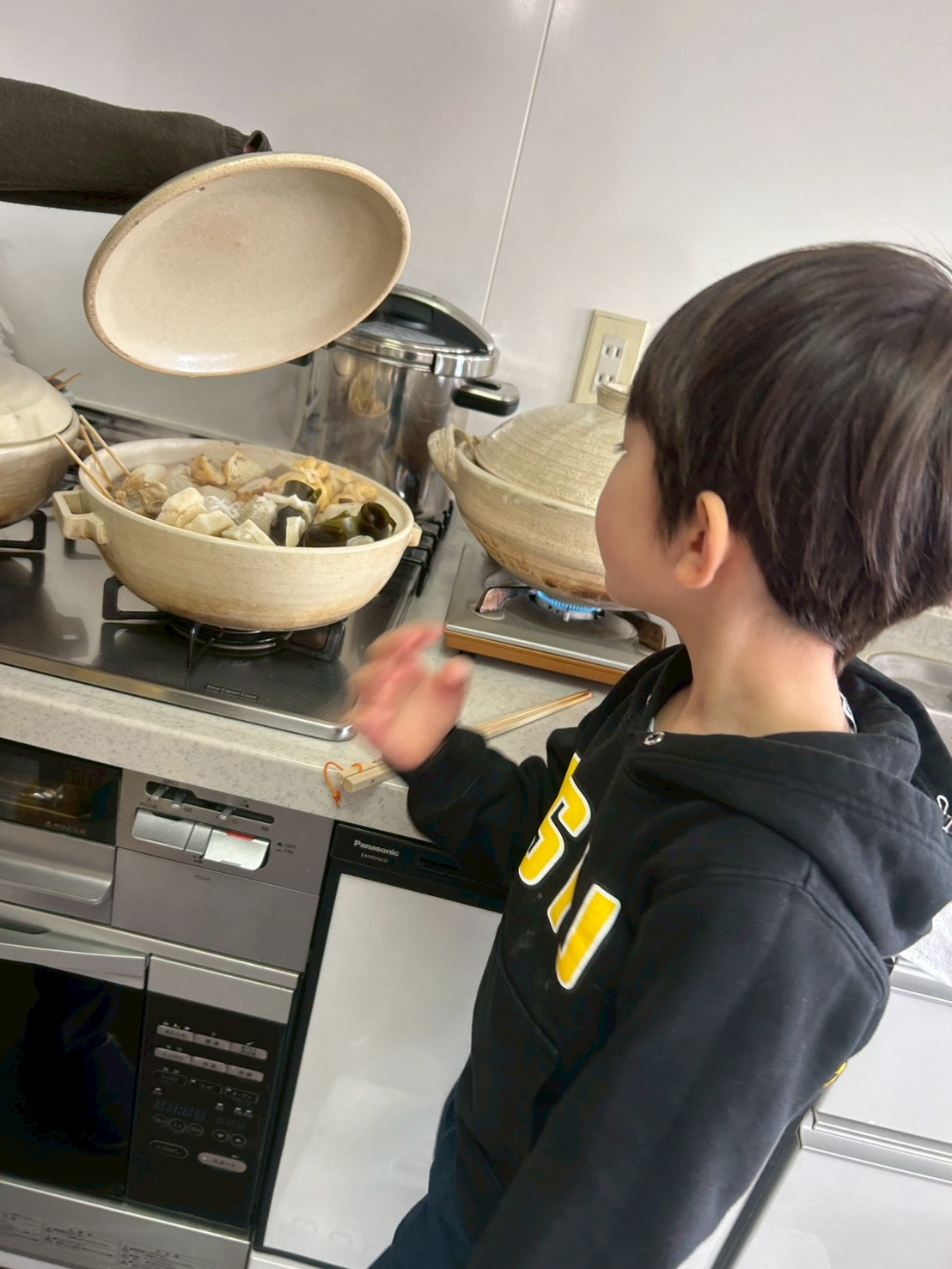 他にもすじやはんぺんを切り、具材が揃ったらみんなで出汁に味付けをします。大きな土鍋に交代で砂糖や醤油、酒を入れたら、用意した具材を丁寧に入れていきました。どこに何を入れるのかもグループで話し合い、美味しそうに見えるように工夫します。その頃には、教室中に広がるいい香りに包まれて、子どもたちのお腹もぺこぺこ。「美味しそう!」「早く食べたい!」という声があちこちから聞こえてきました。