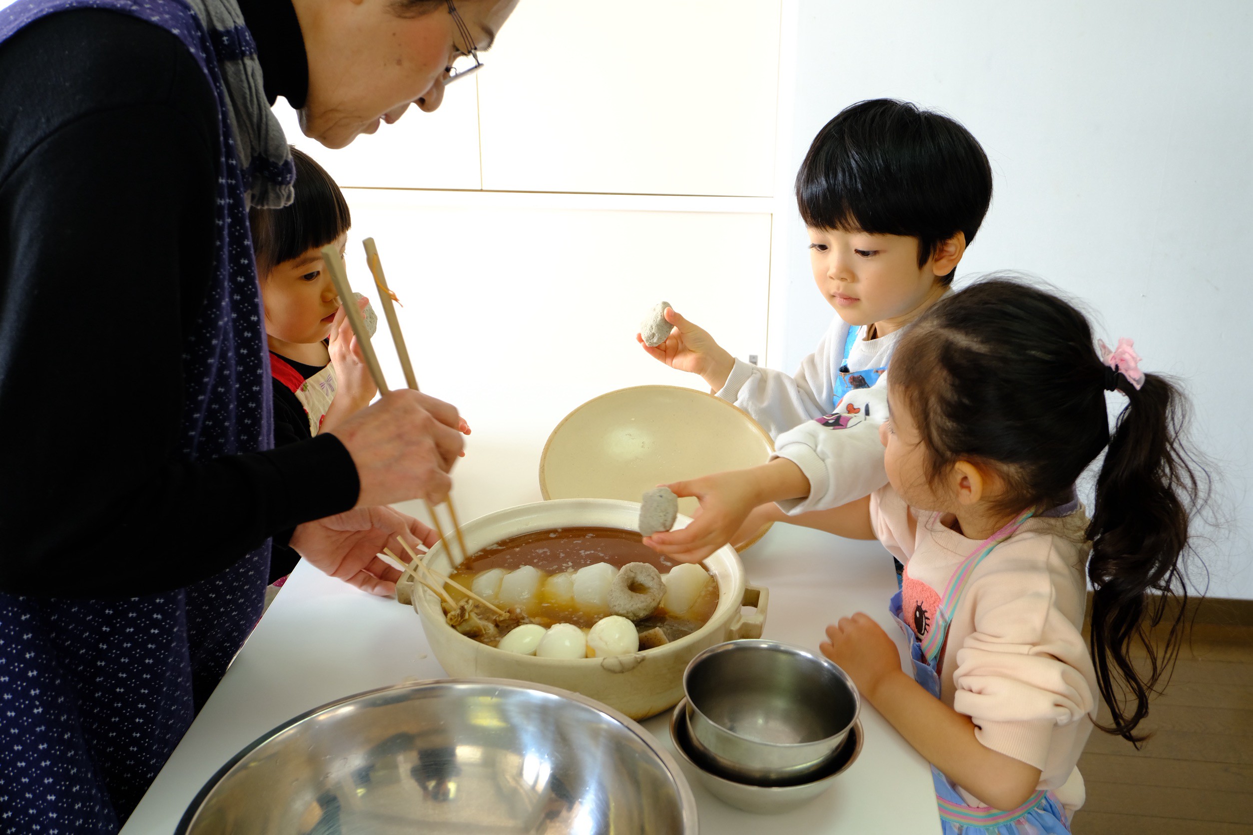 最初に「おでんにはどんな具が入っているかな?」と子どもたちに聞いてみると、おでんを知っている子たちからは、こんにゃく、大根、ちくわなどが挙げられました。今回はたくさんの具材を使うので、一通り見せたあと、3つのグループに分かれて作業開始です。