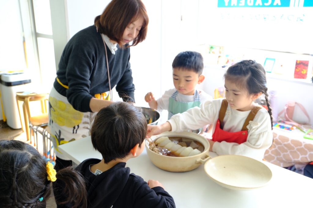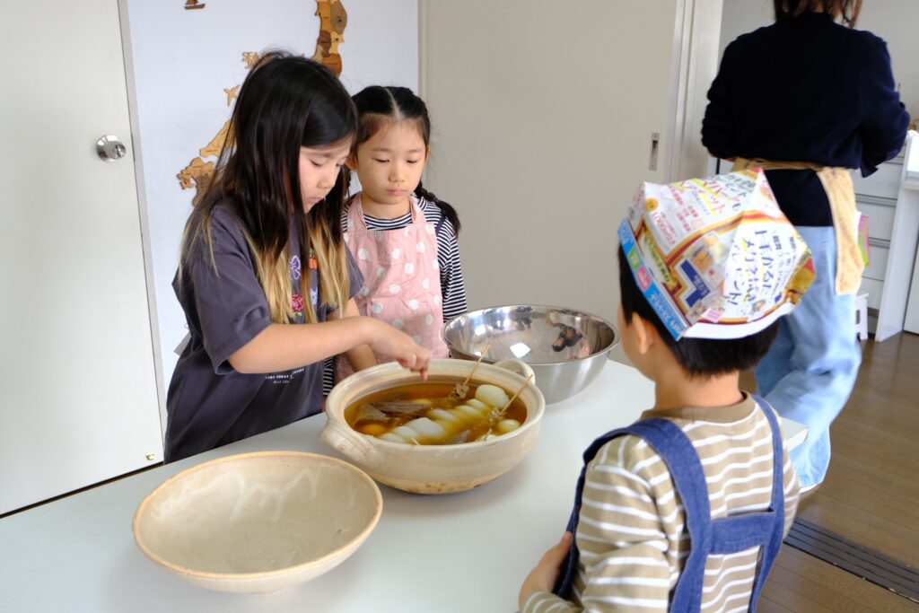 出汁の香りがいっぱいのお部屋に子ども達が集まると、早速にぎやかなおでん作りが始まりました。