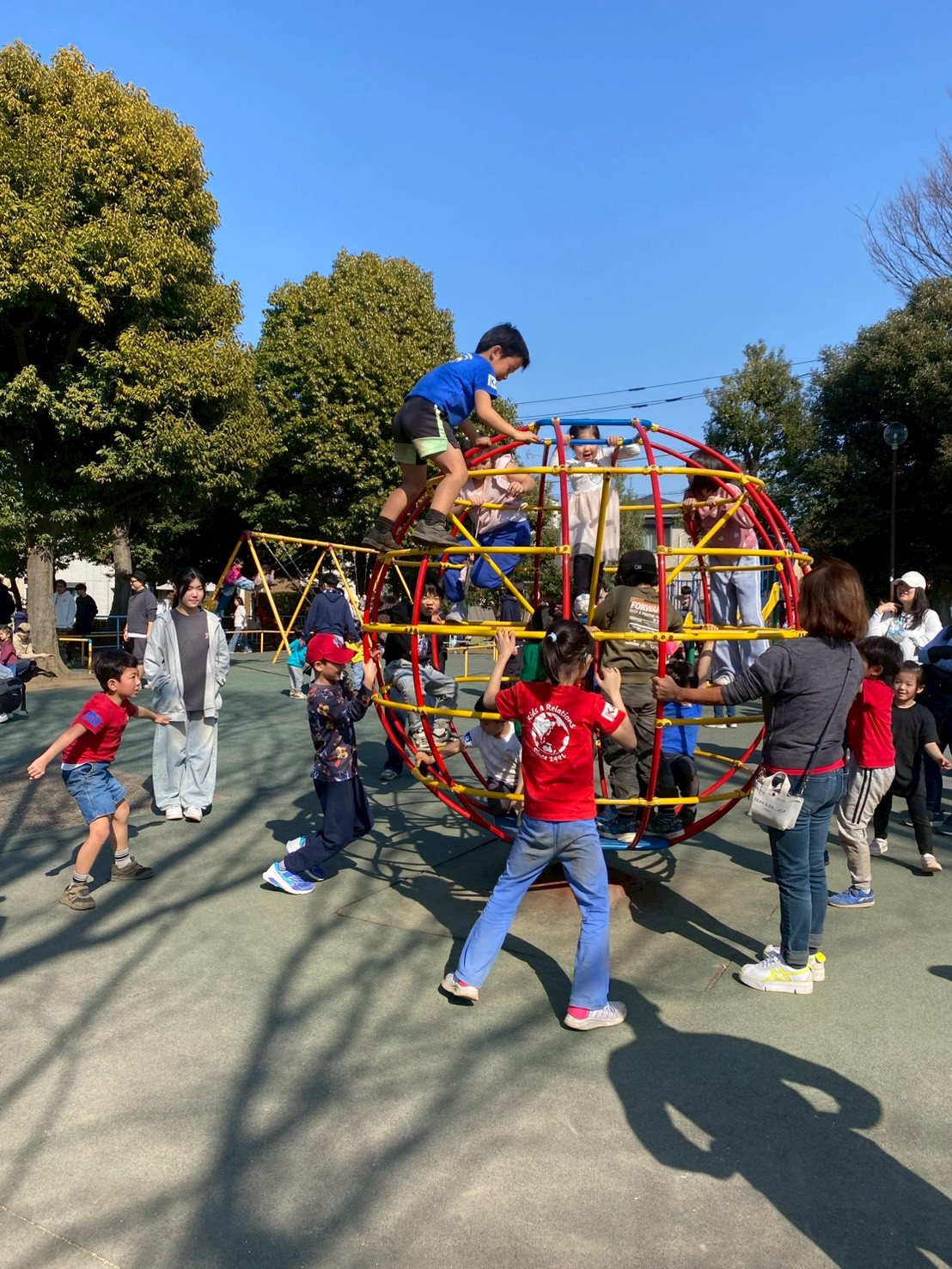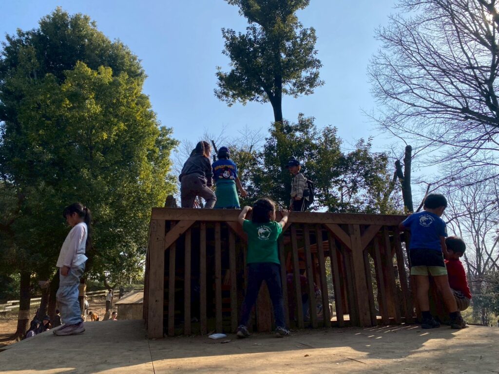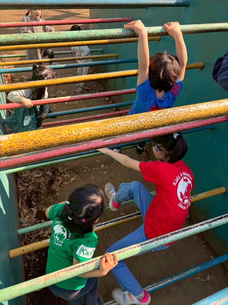 絵を描き終わった後は、公園内でたくさん遊びます。公園内にはたくさんの遊具があり、木製の大きな滑り台やブランコ、うんてい、球型のジャングルジムなど代わり代わり遊ぶことができました。