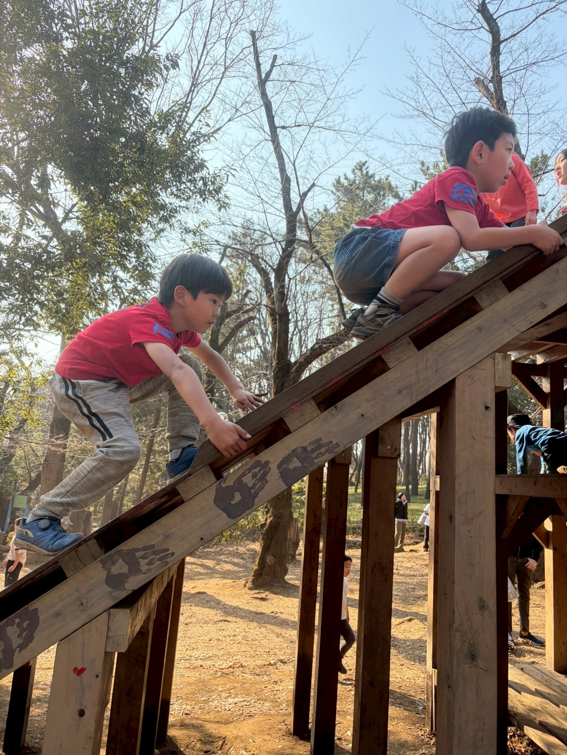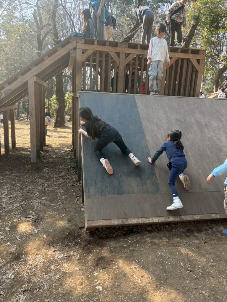 木製の大きな遊具は、大人が手伝わない前提のもので、かなり急な坂がありますが、なんとか自分だけの力で登ってみます。ただよじ登るというのは難しいので、助走をつけてみたり、遊具の隙間に手をかけてみたり、工夫が必要でした。何度も登れなくてずるずると落ちても、もう一度もう一度と挑戦していると、大人の力を借りなくても1人で登りきることができるようになりました。