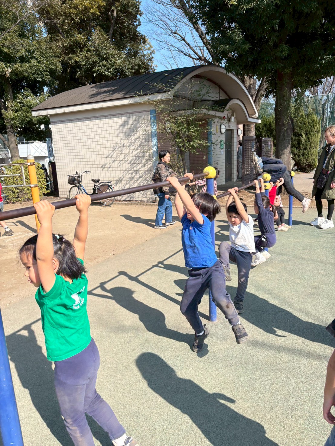簡単には登れないからこそ、登りきれた時の達成感と喜びに溢れたお顔はとってもきらきらで印象的です。できることがまた1つ増えた!と自信にも繋がりました。大人用の健康器具など見たことのない遊具にも積極的に挑戦することができました。