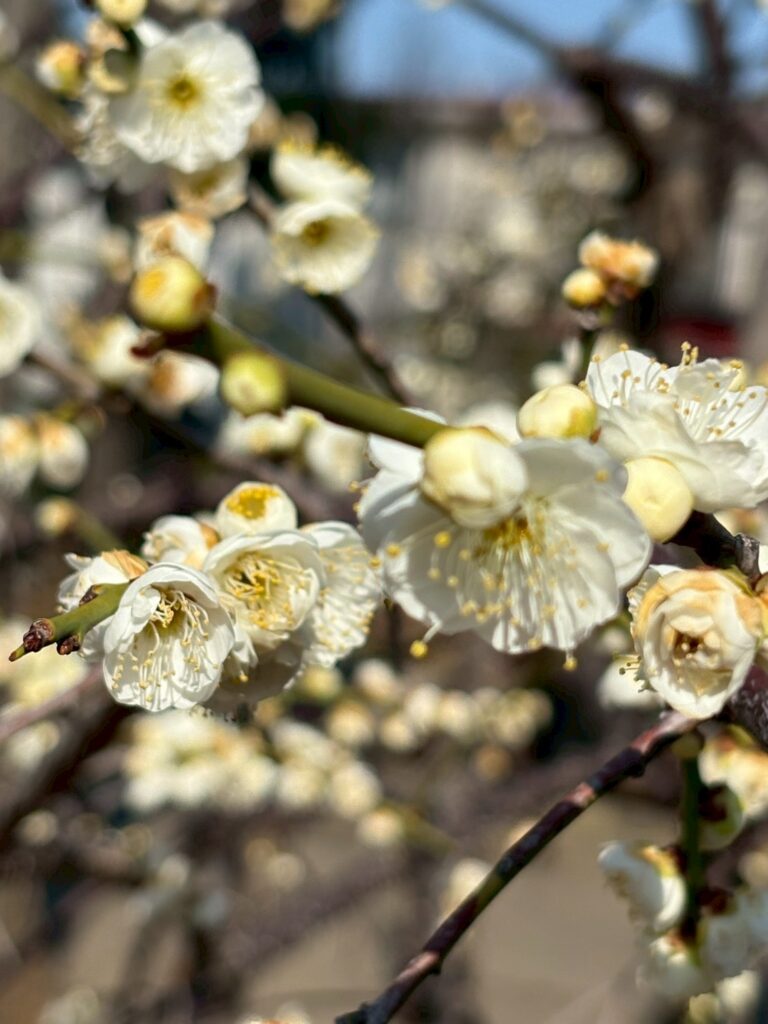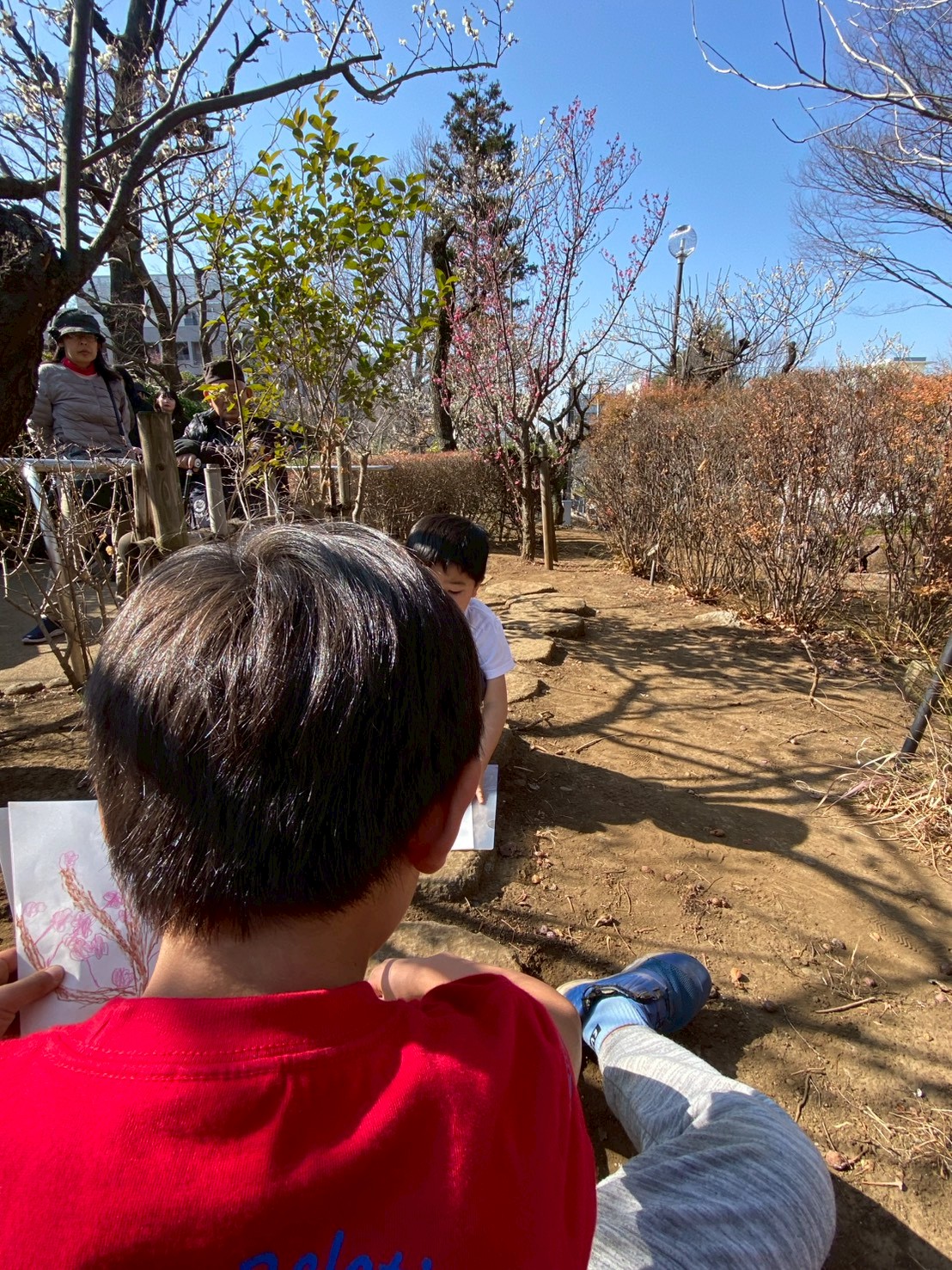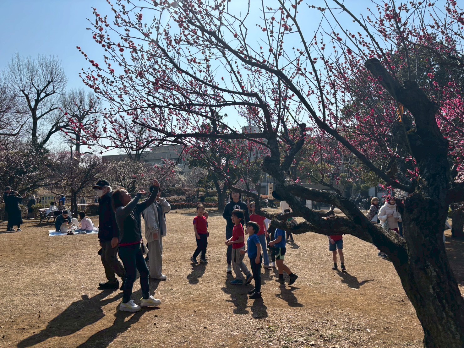 また今日はお天気の良い日曜日ということもあり、公園には人がたくさんいます。先頭を見失わないよう一生懸命歩きました。しかし、右を見ても綺麗な梅の木、左を見ても綺麗な梅の木、ついお花に目を奪われてしまいます。一度荷物を置き、公園内を探検しながら梅の木をよく観察してみると、梅の木も一つずつ種類が違い、お花の色もまた様々でした。種類は、八重野梅、飛梅、藤牡丹、思いのままなど他にも数えきれないほど多くの木が生えていました。