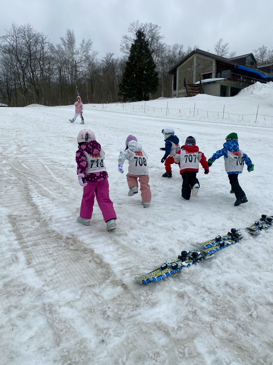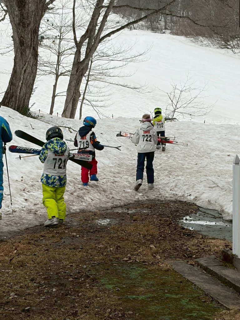スキーが初めてではないお兄さんお姉さん達は、率先してスキー靴を履き、足早にロッジラーを出ました。初めての子もなんとか靴を履き、遅れまいと一生懸命ついていきます。
