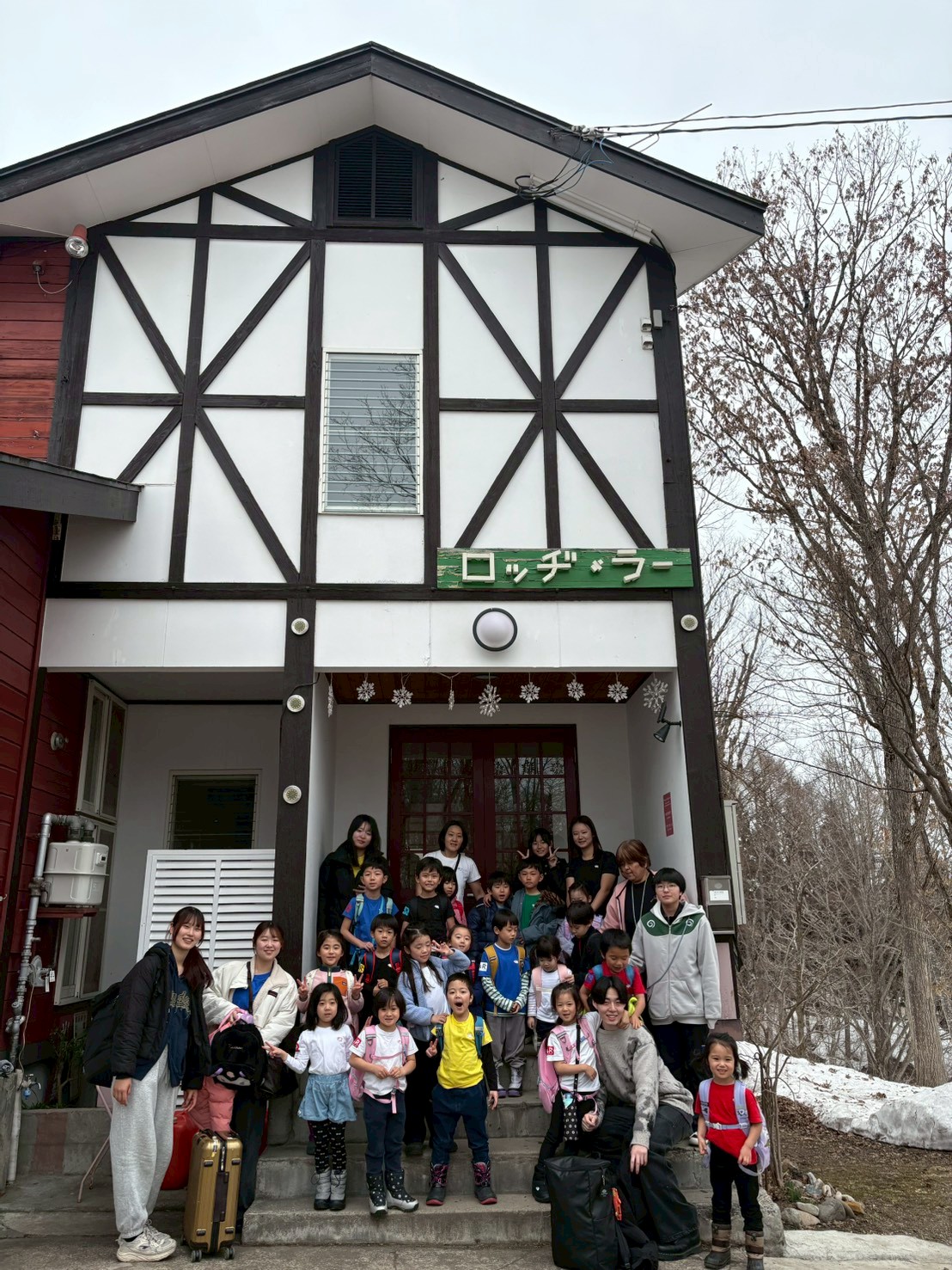 ついに妙高高原駅に到着!校長先生やロッジ・ラーのお母さん方がお出迎えしてくださいました。今年もロッジラーにご挨拶をしました。