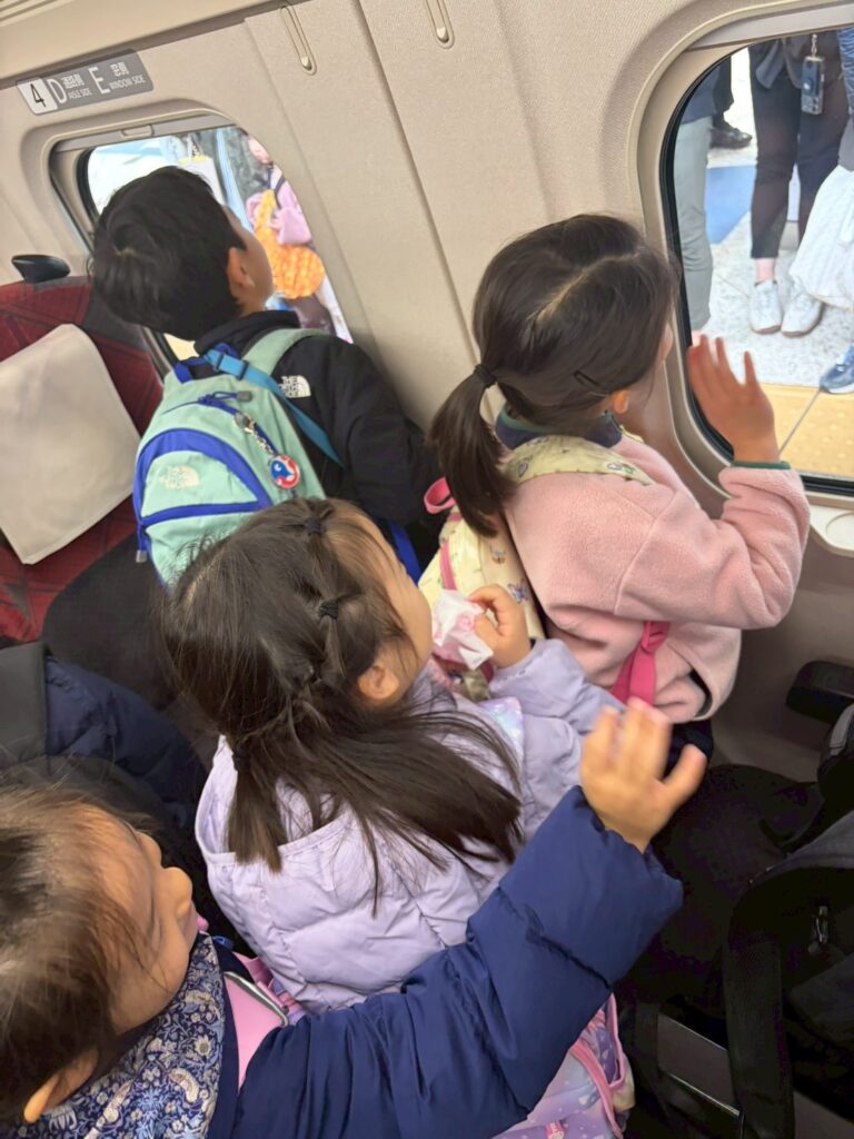 今日からスキーキャンプです。今回のスキーキャンプのお部屋のチームごとに分かれお話ししながら新幹線を待ちます。初めて会う子と挨拶をしたりスキーキャンプに向けてみんなワクワクしている様子でした。新幹線が到着し、お父さん・お母さんに「行って来ます!」とお別れをして新幹線に乗ります。新幹線の中でも、お部屋ごとに分かれ、お話しをしたりジャンケンをしたりみんなで楽しく過ごしました。長野駅に到着すると、在来線に乗り換えるまでの時間はおやつタイムです。ベンチに座りお家から持って来たおやつを食べました。おやつタイムを終え、長野駅発の在来線に乗り換えます。乗り換えた電車は、自分で開くのボタンを押さないと電車の扉が開かないというあまり見られない目ずらいタイプの電車だったため楽しそうに電車に乗っていました。在来線に乗っていると、外に雪が見えてきました。ついにスキーに来たという実感が湧いて来てスキー楽しみ!と話している子たちもいました。