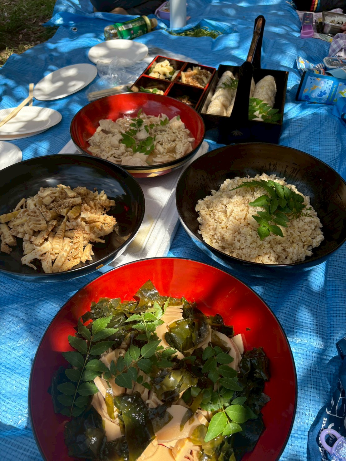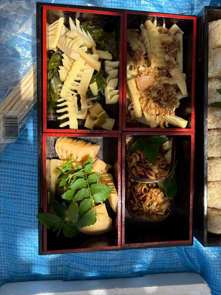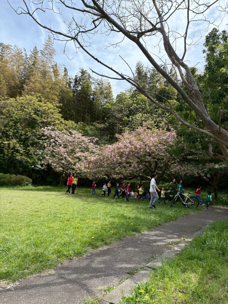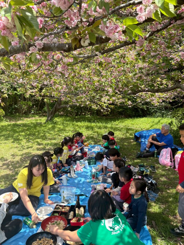 切りがよいところでお弁当にすることにしました。まだきれいに咲いている八重桜の木の下でお花見をしながらお弁当をいただきます。せっかくなので、たけのこご飯、若竹煮、胡麻和えなどたけのこの料理も味わいます。一生懸命掘ったたけのこを持って帰ったらどんな風に食べようかとご家族にごちそうするのをイメージしている子もちらほら。食べてみたら気に入っておかわりをしている子もいました。