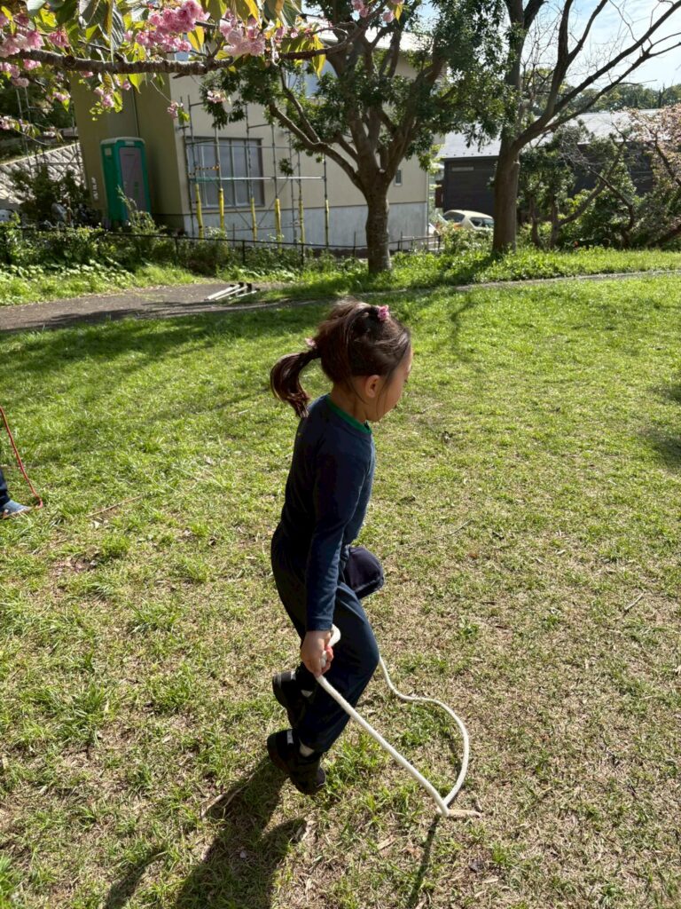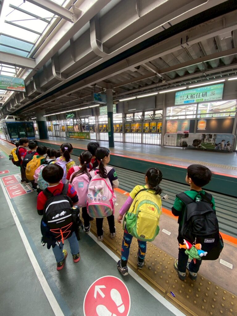 最後に、広場で鬼ごっこや縄跳びなどそれぞれ自由に遊んだ後、お着替えをして、出発の準備をします。竹薮の方々に「ありがとうございました」と挨拶をして西鎌倉駅へ出発します。モノレールに乗り大船駅、横浜駅で乗り換え田園調布に戻ってきました。帰りの電車では、たけのこ堀りで足が疲れていましたが、みんな笑顔で、たけのこ堀りの話やモノレールの話をしながら楽しく帰ってくることができました。