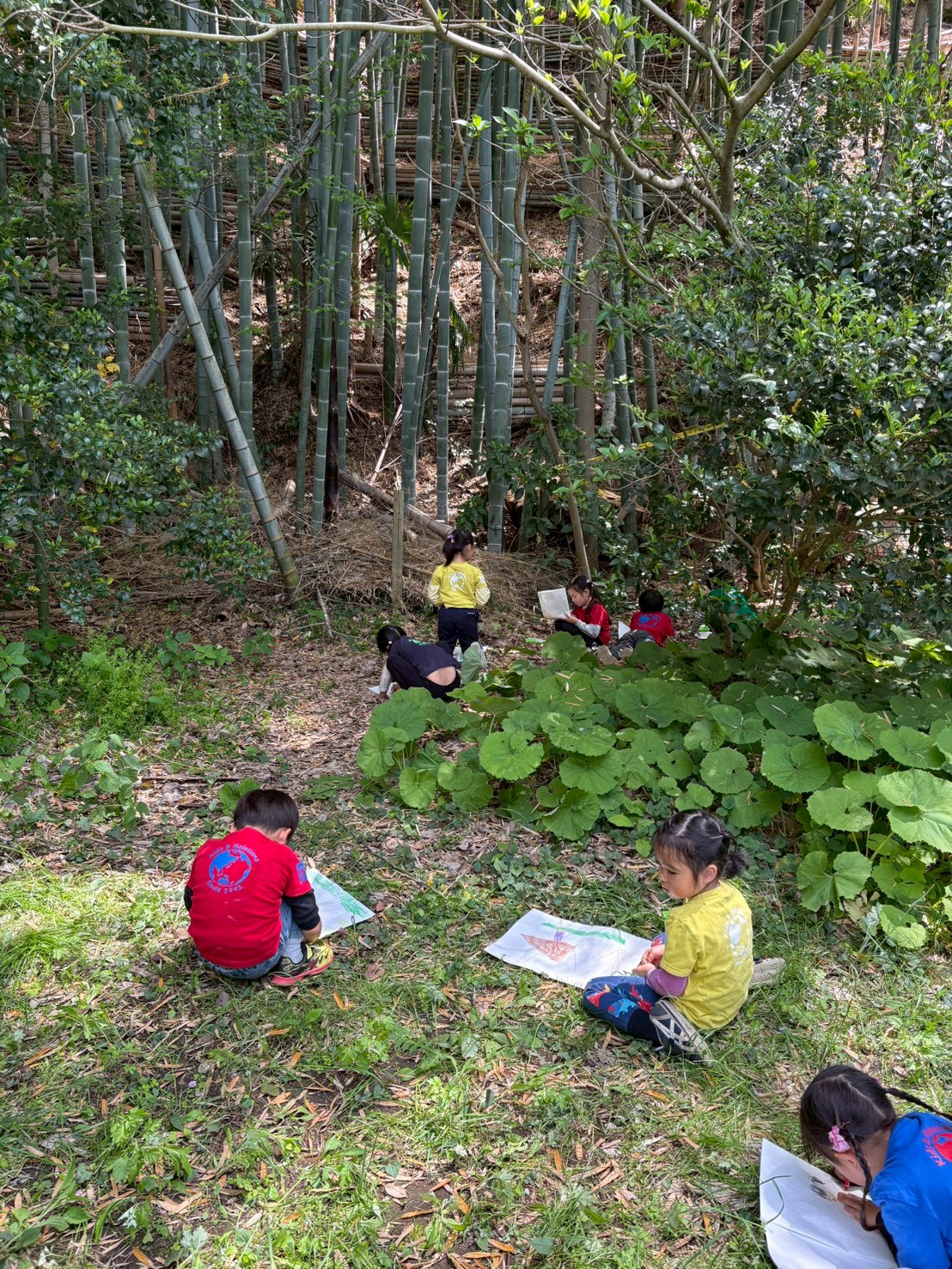 お昼ご飯を食べ終わると、次はお絵描きタイムです。たけのこや竹の目の前まで行きよく見ながら絵を描きます。たけのこが竹に変わる途中の状態も見ることができました。