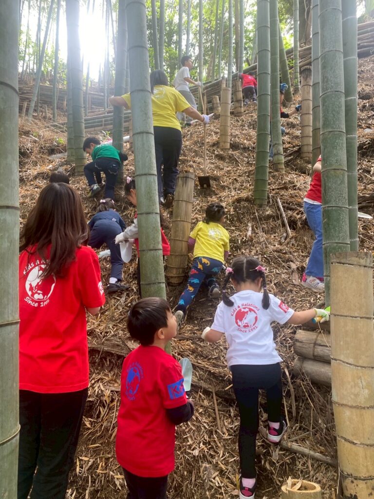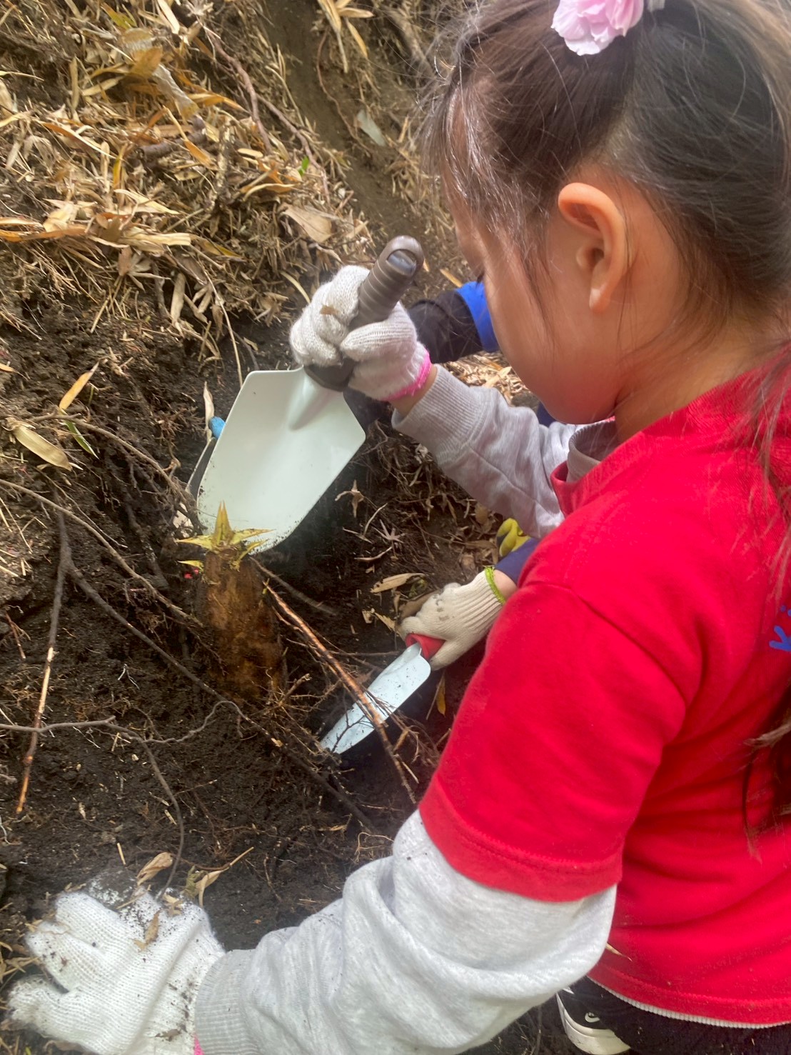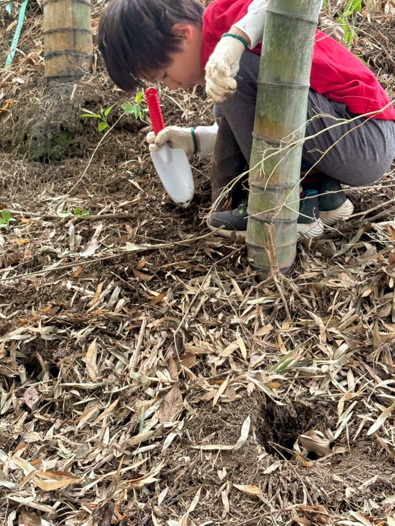 お絵描きを終えると、「またたけのこを探しに行ってきていい?」とまだまだやる気満々です。午前中と同様に急な竹藪を竹を伝いながらのぼり、落ち葉の下に隠れているたけのこの頭を探します。午前中には無かったところからも午後になると出ていることに気がつきました。朝、なかなか見つけられなかったのがウソのように次々見つかり、数人で協力しながら午前中よりも慣れた手つきでどんどん掘っていきます。一本を掘り進めている途中で赤ちゃんたけのこが見つかることもありました。