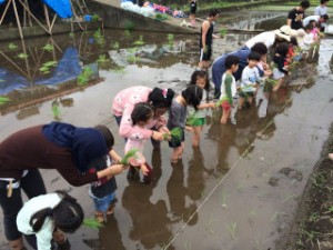 空いているスペースに勝手に植えるのではなく、全員で横一列に並び、自分の担当の列にまっすぐ植えていきます。不安定な足場のなか、後ろ向きに一歩ずつ進むのは子ども達にとってなかなか大変な作業です。途中何度も何度も尻餅をついては立ち上がりを繰り返して、洋服はあっという間に泥だらけになりました。それでも、どこに立てば植えやすいのか、稲の苗をしっかりと立てて植えるにはどうしたらよいのかなど、工夫しながら夢中で取り組み、ふと顔を上げると今まで植えてきた苗がきれいに列をなして一面に広がっていました。
