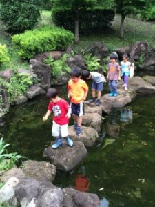 疲れ知らずの子どもたちはお絵かきを終えると近くにあった池に走っていきみんなで遊びました。池には大きな鯉がいたり、池の近くにウメが落ちていたり子ども達はたくさんの発見をしました。
