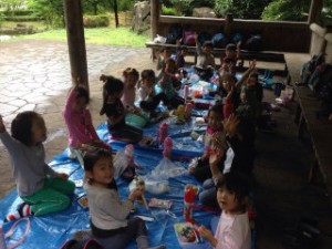 全身を使い、たくさん苗を植えた子ども達はお腹ペコペコ。お母様が作ってくださったおいしいお弁当をいっぱい食べ、その後、田植えの様子をお絵かきしました。田植えの様子だけではなく田んぼにいたアメンボや鳥を描く子どもや、たくさんの色を使い鮮やかに仕上げる子どももいました。みんなそれぞれの田植えを思い出し、上手に描くことができました。