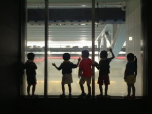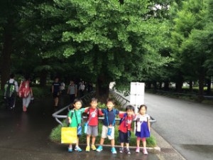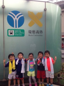 ゴールできた喜びの笑顔が溢れる記念撮影をし、慶應義塾大学の探険に行きました。広いグラウンドやプールに子どもたちは夢中でした。プールでお兄さん、お姉さんが準備体操を始めると、いつも自分たちのやっている体操と同じ動きを発見したり、手がピシッと伸びているほうがカッコ良いと発見したり、子どもたちは新しい気づきがいっぱいのようでした。