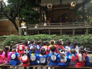 たくさん歩き、体操をしてきた子どもたちはお腹ぺこぺこです。お母様が作ってくださった美味しいお弁当を神社の中でいただきました。たくさん体を動かして食べるお弁当の味は格別でした。お弁当を食べ終わると神社で行われていた笛太鼓の演奏を聴き、その様子を絵に描きましました。きれいな笛の音色や豪快な太鼓の音に子どもたちは興味深く聴き入っていました。また、お囃子のリズムに合わせてとても楽しそうに踊っている年少さんもいました。