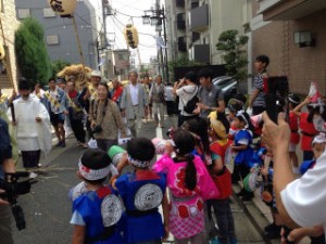 途中でお神輿の列を抜けて体操もしました。普段通りに手を伸ばすことなどに気を付けながら丁寧に取り組みました。体操を終えると再びお神輿に合流して、奥沢神社に無事到着しました。