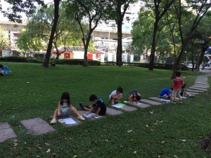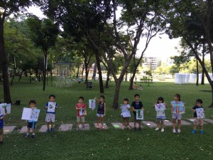 子ども達にとってとても身近な公園に、朝7時に集合しました。私はタイに来て、日の出とともに歩きラジオ体操をしています。公園は子ども達にとってとても楽しい場所です。久しぶりに会う顔が朝日に負けないくらいに輝いて、ニコニコでした。早速、公園の周りのランニングコースを走ります。元気一杯の子ども達はとても速いペースです。でも今日はマラソンではないので、途中でお花の香を嗅いだり、日向と日陰で暑さを比べたり、みんな一緒だから何だって楽しい!それぞれの子どもがいろいろな発見をしては目を輝かせています。今日はえりこ先生がお手伝いをしてくださり、皆が元気いっぱいに朝を楽しんで、一日をスタートさせてくれるように、いろいろな新しい試みもたくさん考えました。いつも日本で子ども達が楽しんでいるように、バンコクの子ども達も「よく見て!・よく聞いて!・よくお話をして」をいっぱい感じ使ってほしいと思います。身近な公園ではありますが、普段はこんなに充実して過ごしているでしょうか?お友達と一緒だから、自然のなかでたくさんの発見をしながら、良い汗をながしました。