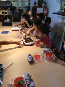 こうたろうくんのお宅が公園のそばで、ご厚意に甘えて皆でランチボックスを作ることにしました。まずは世界に一つだけの自分のお弁当ボックスに絵を描きます。本来は準備から子ども達だけでさせてあげたいのですが、今回はお母様方のお手伝いをいただいて、色とりどりのお野菜を入れたり、元気玉を作ったり、大好きな唐揚げをつめたり、同じお惣菜なのに一人ひとり入れ方も出来上がった内容も違っていました。こんなところからも個性が光っているのを感じ、その個性をますます磨いていってほしいと思いました。