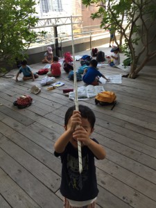 お昼の後は、「この木何の木」の歌を歌いながらお絵描きをしたり探検をしたりします。シートでつかった新聞紙は今度は遊び道具に変身、くるくる巻いて得意な棒を作りました。お池で釣り竿みたいにしてみたり、電車ごっこをしたり、輪っかを作ってみたり、楽しい遊び道具がたくさんできました。楽しそうな子ども達の様子に、観光客も釘付けになっていました。子ども達はどんな場所でも遊びを考える天才なのだな!と痛感する場面でした。