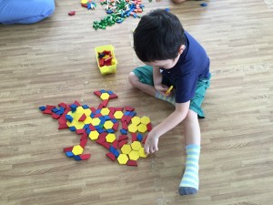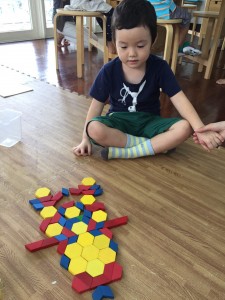 クラスをはじめる前は、自由にパターンブロックに触ってもらう時間にしました。はじめてパターンブロックに触る子も、クラスに飾ってあるパターンブロックの写真を見よう見真似で作り始めました。とても上手です!