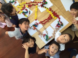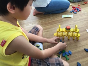 どの活動も、はじめてクラスに参加しパターンブロックに馴染みがない子は特に、「これでいいのかな?」と不安そうな様子もありますが、個性ある作品が出来たときに褒めてあげると、どの子もクラスに一体感を持って目を輝かせるものです。そして、「積む」ことの難しさを感じた子どもは「積みたい!」という気持ちで集中することがよく分かったクラスでした。