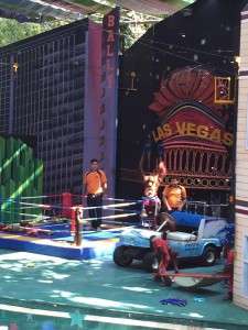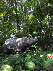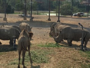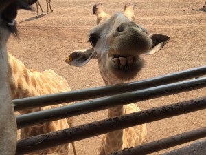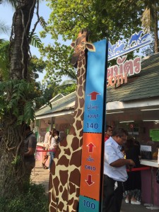 ゲートにはキリンと背丈比べをするものがあります。ここでは年齢の他に身長によって料金が違うそうです。日本との違いをまた一つ経験しました。ゲートを入るとキリンやゾウで飾られた噴水に虹がかかっていて、全員で記念写真を撮りました。