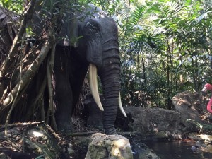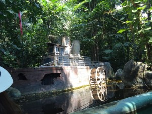 ボートでジャングル探検に出かけました。川の流れ、野生の動物という自然に加え、本物によく似せて作った動物もいます。急に水をかけられるしかけがあったり、お面を付けた部族の人形が矢を放ってきたりと、ちょっぴり怖くてキャーキャー言いながらも興味津々、目を輝かせる子ども達でした。家族を離れ、同年齢の子ども達と一緒だからこそチャレンジできることもあるように思います。ボートを降り、揺れる長いつり橋を渡ったところで休憩にしました。