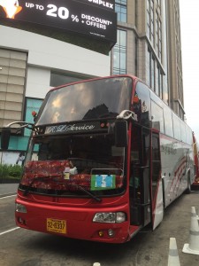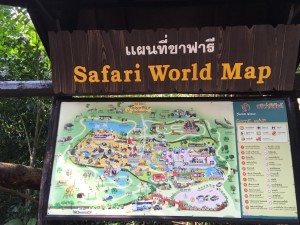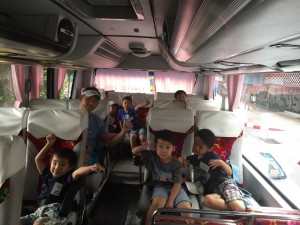 40人乗りのバスにゆったりと座ったら、出発の点呼をします。日本とは違い暑い土地なので、お弁当はクーラーボックスへ。さあ、出発です。バスの中ではリピーターの子がはじめて参加した子をリードして盛り上げてくれます。「大型バスに乗ってます~♪」と歌を歌ったり、季節の歌や、「ぞうさん」などの動物の歌を歌っているとすっかり楽しい雰囲気に!サファリへ行く準備として、先生が読むキリンの詩をみんなで復唱したり、バスの窓からの景色を見たりしました。バンコクに住んでいる子ども達はバスの移動に慣れていますが、「どんな木が生えていてどんな花が咲いているかな?建物はどうだろう?高層ビルもあるけれどバラックのような家もなるね」など、あえて注目してみました。普段からの友達同士だけでなく、いろいろな子と声をかけあって楽しいバスの時間をすごしていると、約50分ほどで渋滞もなくあっという間にサファリに到着しました。