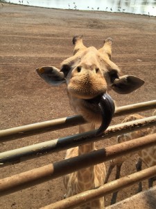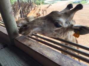 またキリン・テラスに戻り絵を仕上げたら、今度は餌付けに挑戦です。「よだれがすごい!」と言いながら、棒にバナナを刺してキリンにあげます。そういえばサファリに来る途中、窓からバナナがなった木を見たのでした。はじめは恐々餌付けしていた子も慣れてくると楽しそう。子ども達が横一列に並んで餌付けするので、気が付けばキリンも横一列に並んでいます。とても近いところでキリンを見ると、色の濃さに違いがあったり、ラクダのようなひげがあり耳の位置に特徴があるなど、意外な発見がありました。