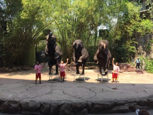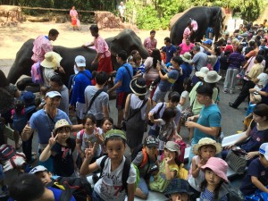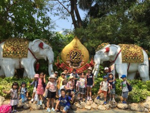 ゾウのショーがある会場へ来ました。開始までまだ時間があるので、今まで見てきた動物達をお絵描きしていました。やがてインドなどいろいろな国から来た観光客が集まってきましたが、私達のグループの小さな子ども達がリュックサックを背負っている姿を微笑ましく見てくださっているようでした。ゾウのショーではサーカスで見るような曲芸の披露や、サッカーをする場面もありました。芸達者なゾウはとても頭が良く、タイでは昔から王族とも深い繋がりがあり崇められている動物です。ゾウが長い鼻を使って器用に絵を描く姿に子ども達はびっくり!ゾウの絵が上手なものですから、自分達も上手に絵を描きたい!という気持ちになったようでした。ショーの後には近くでゾウを観察することができ、優しい目をしたゾウの皮膚には細かいしわがあり、そこに毛が生えていることを知ったり、ゾウに触ってみることもできました。