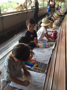 さあ、今日の目当ての一つ、キリンのエリアへ向かいます。なんと、400頭ものキリンがお出迎え!背の高いキリンを観察するように、ウッドデッキのキリン・テラスが出来ていて、子ども達はそこのベンチでキリンをお絵描きします。自分達と同じ目線のその先に、大きなキリンのお顔が並んでいるので、キリンの視線にドキドキします!ここでドラえもんのポケットから出てきたのは「和凧」です。これは、1月のどんど焼のときに日本の子ども達がお絵描きをした凧と同じものです。骨組みもあり書きにくいところもありますが、「ヤマト糊」のヤマトさんからいただいた「シルキーツイスター」という水性クレヨンで、子ども達は喜んで描いていました。このクレヨンはとてもなめらかに描け、水を付けた筆でなぞると絵の具になるなど、いろいろな使い方が楽しめます。せっかくいただいた新しいお道具を大切に使っていくために、使い方も学びました。