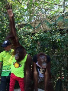 再び園内に戻り見学を再開します。歩いていると移動中のオラウータンに遭遇しました。触ってみたり、写真を撮らせていただきました。長くて人間みたいな手、大きな足をしているということがとてもよくわかりました。