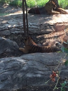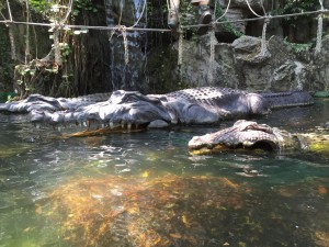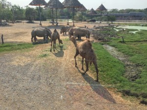その後はジャングル内を歩いてまわります。少し行くと本物のワニがいました。柵があるものの、なかなかの近さです。地面と同系色のワニでした。休憩を挟みながらゲートを出てバスでサファリを周りました。ライオン、シマウマ、サイ、水牛、トラ、ラクダ、カバ、シカ、ペリカン、フラミンゴ!「水牛の角は大きいね!」「あれ?あっちに一頭だけ黒いラクダがいるよ!」バスで近くに行って窓から観てみると、それは泥だらけで黒くなったラクダだとわかりました。暑いのか、トラやクマは水浴びをしていました。好きな場所で停まりながら観察ができるので、合計1時間ほどかけてじっくりと動物たちを観察することができました。もしも再び来ることができたら、動物たちの動きをお絵描きしてみたいと思いました。