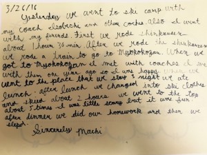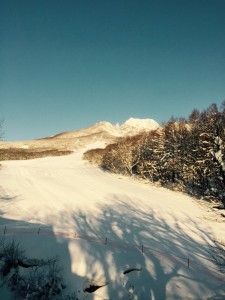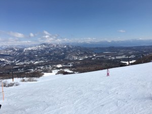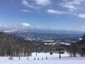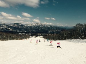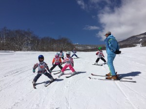 今日もスキー三昧の一日です。午前午後と2時間半、計5時間それぞれのグループに分かれ練習です。天気は快晴でとても暖かく、昨夜降った積雪もあり、パウダースノーで最高のコンディション、スキー日和です。子ども達は昨日滑ったおかげで今日は朝からスムーズに滑っており、どんどん上達していきました。今日は全部のグループがリフトに乗って上から滑っていました。