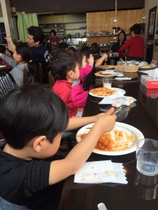 午前中スキーをたくさん滑って、待ちに待ったお昼ご飯。今日は行列のできるスパゲッティ屋さんです。ミートソーススパゲッティを全員おかわりして、行列のできるスパゲッティ屋さんは閉店です。小さな子達も小学生のお兄さんお姉さんを見習って、口の周りにミートソースがつかないように上手に食べていました。