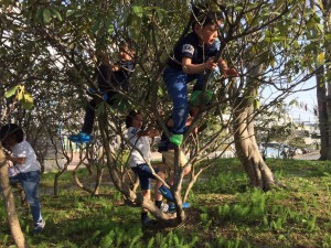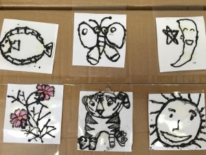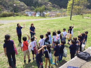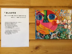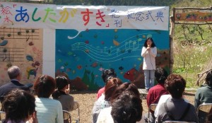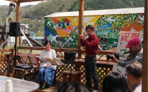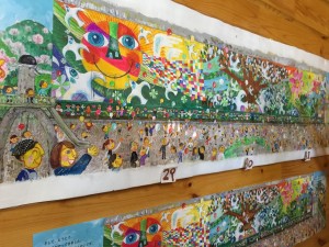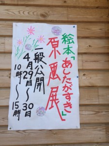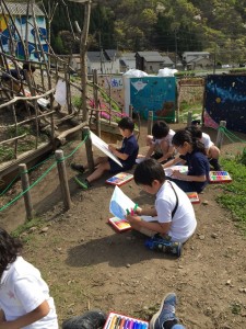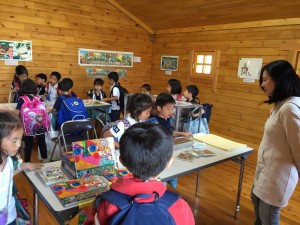 こすもす公園に戻る途中、みんなで歌の練習をしました。小学生が幼稚園に教え、全員で歌えるようになりました。こすもす公園では2周年のお祝い・絵本・ログハウスの完成のセレモニーが行われていて、小高い丘が舞台のコンサートの後で「虹」に手話をつけ、歌を披露しました。心をこめて丁寧に上手に歌うことが出来ました。こすもす公園はいろいろな顔をもっていて、遊び場はもちろん、コンサートをしたり、ワークショップをしたり皆が楽しめ、癒される場所です。新しくできたピーターハウスでは、絵本の原画展をおこないました。実際に絵本になるまでの原画をみて、細かい絵をじっくり見入っていました。東京とは違い、記念式典のパーティーもすべて手作りです。