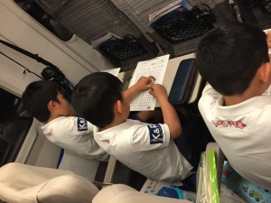 電車に乗り込むと、まずは日記タイム。いつもならみんなで向かい合わせにする座席も、勉強机に早変わり。年長さんもお手本の小学生を見習い無心に絵を描いていました。何を描こうかな?と思う間もなく、筆が進みます。やはりまだまだ復興ができていない景色は印象的だったし、また東北の方々のあたたかい受け入れを肌で感じたことが描かれていました。日記の後は、やるべき勉強。全員一生懸命に取り組みます。