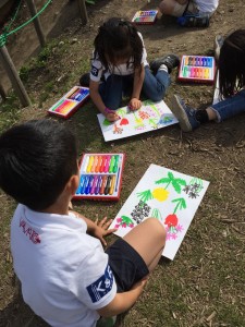 というアナウンスで、点々としていた子ども達がきょうこ先生のところに集合します。先生はどんなに忙しくても子ども達のために時間を惜しまず指導をしてくださいます。だから、賢三をはじめ、小学生達はみんなきょうこ先生がだ~いすき!そばで甘えてみたり、時には厳しくお絵描きをしっかり教えていただいたり・・そんな様子をみていた年長さんだって、きょうこ先生が大好きになっちゃいました。だからきっとお絵描きを楽しむ種をまいていただき、たくさん描きたくなっています。どの子の絵も生き生きと、のびのびと描けるようになってきました。 最後のワークショップはこすもす公園のお花を描くことです。それぞれの子ども達がたくさんのお花を描きました。これは最後まで終わらなかったので宿題です。今回はたくさんの宿題があります。でもたくさん感じたこと、思ったこと、体験したことを思い出しながら仕上げて、きょうこ先生にお見せすることをお約束しました。きょうこ先生&いそべっちの掟!「一回で聞くこと!」これができなければ、誰も手伝ってくれないこと、このキャンプで少し体でおぼえたでしょうか?最後に壁画の前で、一年生の指導の下で作り、覚え、練習した「ありがとう」を歌いました。この歌詞の中には、こすもす公園で過ごしたたくさんの思い出、きょうこ先生、お父さん、お母さんへの感謝の気持ちがはいっています。