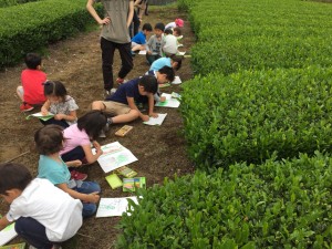 やっとわさび茶屋に着いたところで山から見える景色のスケッチです。茶畑の絵や、遠くに見える家々や景色の絵など思い思いにスケッチします。絵を描いていると、箱根の山が見えたりお茶畑の大きな扇風機を見つけたり、発見がたくさんあります。