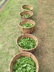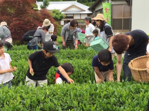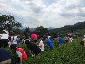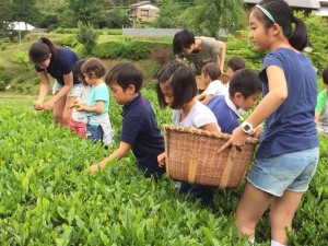 いよいよお茶摘みの始まりです。5つのチームに分かれてお茶摘み競争をします。畑の方から新茶とはどのようなものかを教えていただき、「羽みたいな形だね」「ちょうちょみたいな形にも見えるよ」と子ども達はそれぞれの印象を話し合っていました。1芯2葉で葉を摘んでいきます。子ども達は一生懸命に新茶を探し、次々にかごへ入れていきました。新茶が見当たらなくなったときも、実は足元にもたくさん新茶があることを発見した子ども達は「ここにもあるよ」と教え合い、1位になろうと頑張っていました。また、途中でお茶の葉を食べ「苦いけどおいしいよ」とお話ししているのが聞こえる一幕もありました。