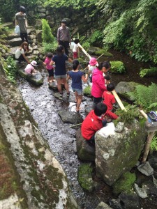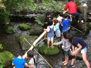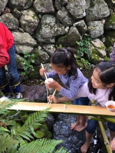わさびが育っているさわの木陰で流しそうめんも行い、きれいな水に手足をつけながら涼むこともできました。お箸で流れてくるおそうめんを必死に器へ。食卓とはちがって、足元もガタガタでバランスを取りながらいただくのは、とても難しかったです。「お箸の練習だって、絶対にもっと上手になるよ!」という声も聞こえてきました。
