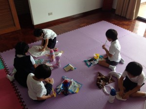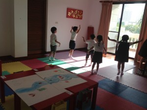 タイバンコクでは、秋の受験に向けての本格的な模試クラスははじめてです。本番さながらに、きちんとした服装・ご挨拶など、試験以前の内容の、できて当たり前の事に着目します。行動観察で共同制作をしたり、絵を描いたり、リズムを身体で表現したり、巧緻性や運動の取り組みなど本番で求められる要素を2日にわけて確認しました。