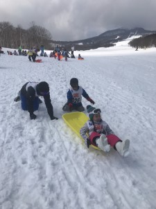 そのあとは雪の運動会!コーチの先生方にも手伝っていただきながら、みんなでそりに乗り滑りました。大きいお兄さんお姉さんたちが一生懸命チームを回しているすがたは可愛らしかったです。そのあと少し雪合戦をして、お昼ご飯。ロッジラーでの最後のお食事です。この日のメニューはおうどんと混ぜ込みご飯でしたが、混ぜ込みご飯は大人気で、行列のできるご飯屋さんができました。