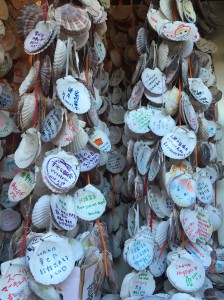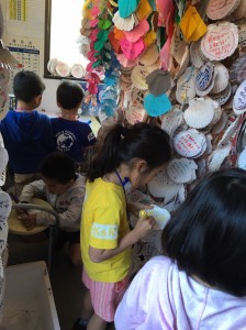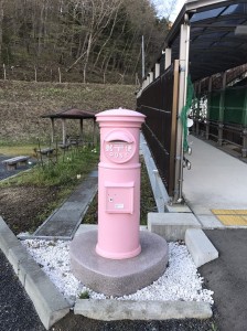 十分に眼に焼き付けるとまた列車は進みます。次に車両は”恋し浜駅”に停車しました。この駅は、景観だけでなく、独特な風習があります。それはホタテの貝殻に願い事を書き、駅内の紐に吊るすというものです。子ども達も昨晩のバーベキューで自分たちが食べたホタテの貝殻に各々自由に願いを書き、同じく紐に吊るしました。ここでは、さらに、土台の石造部分がハートに型どられた、この駅でしか見られないピンクのポストも発見しました。